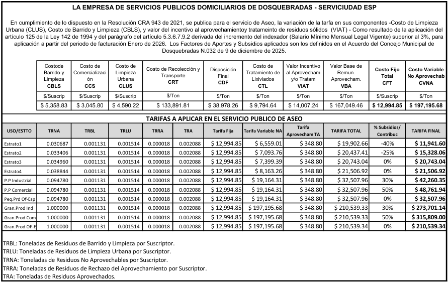 En cumplimiento de lo dispuesto en la Resolución CRA 943 de 2021, se publica para el servicio de Aseo, la variación de la tarfa en sus componentes -Costo de Limpieza Urbana (CLUS), Costo de Barrido y Limpieza (CBLS), y valor del incentivo al aprovechamientoy tratameinto de residuos sólidos (VIAT) - Como resultado de la aplicación del artículo 125 de la Ley 142 de 1994 y del parágrafo del artículo 5.3.6.7.9.2 derivada del incremento del indexador (Salario Mínimo Mensual Legal Vigente) superior al 3%, para aplicación a partir del periodo de facturación Enero de 2026. Los Factores de Aportes y Subsidios aplicados son los definidos en el Acuerdo del Concejo Municipal de Dosquebradas N.032 de 9 de diciembre de 2025.